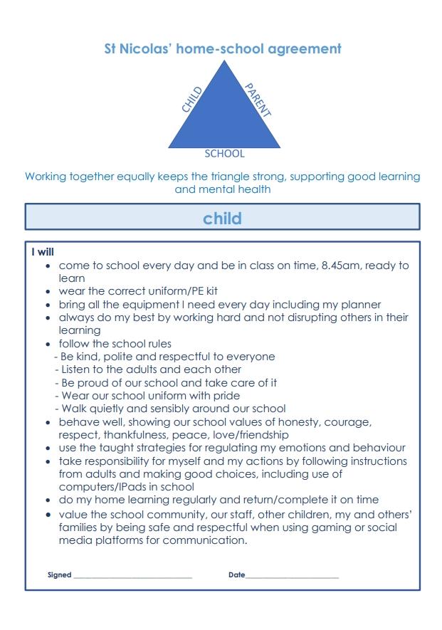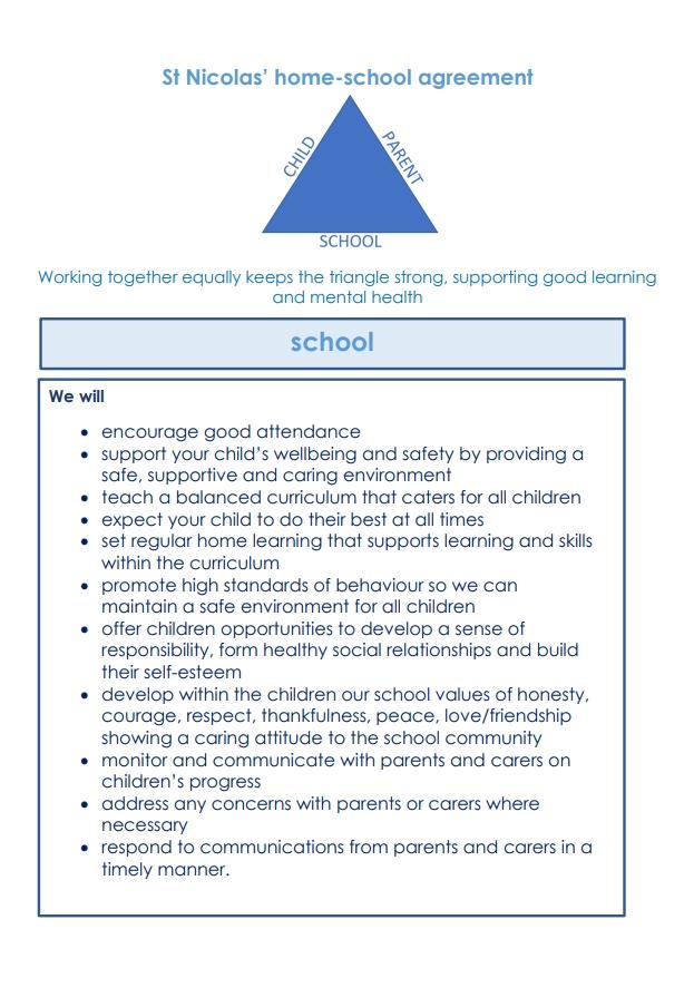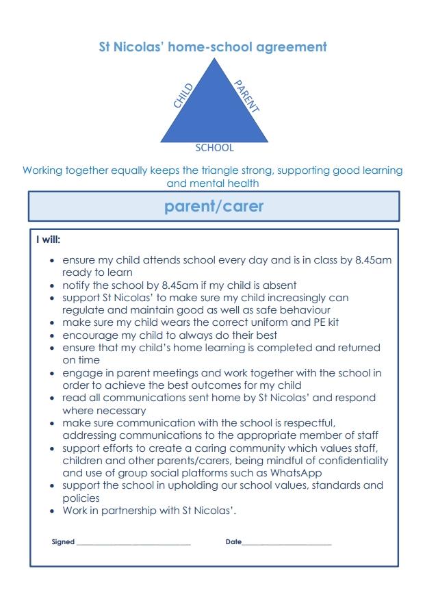At St Nicolas, our home-school agreement sets out clear expectations to promote effective partnership between the school, parents and children. Working together equally keeps the partnership strong, supporting good learning and mental health. Every year, we publish this in the children’s planners and ask parents and children to read and sign.