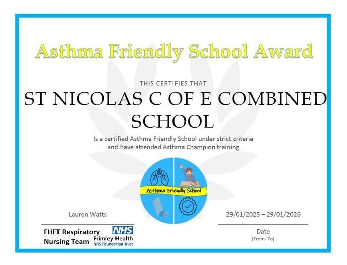 We are pleased to announce that having completed our Asthma Champion training in conjunction with Frimley Health NHS Foundation Trust Respiratory Nursing Team we have been certified as an Asthma Friendly School